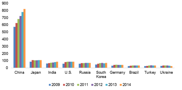 Top 10 producers of crude steel, 2009 - 2014 (million tons)