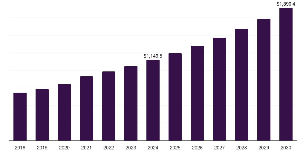 The global diagnostic testing blood typing market size was valued at US$ 1,149.5 million in 2024 and is estimated to grow at a compound annual growth rate (CAGR) of 8.7% from 2024 to 2030.