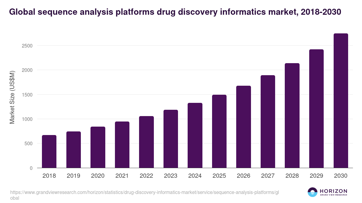 The global sequence analysis platforms drug discovery informatics market size was valued at US$ 1,328.6 million in 2024 and is estimated to grow at a compound annual growth rate (CAGR) of 13% from 2024 to 2030.