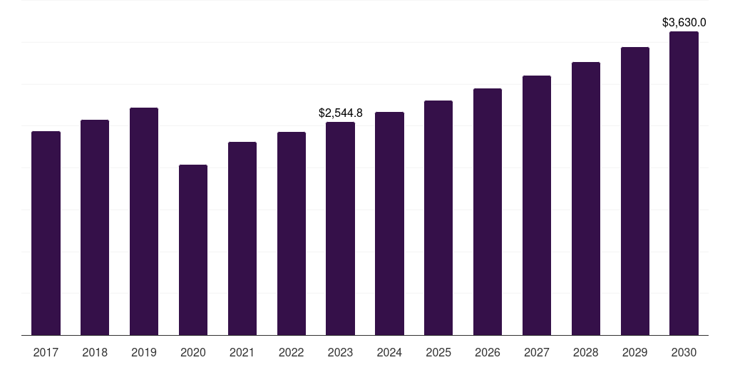 The global pharmacies and drugstores nail polish market size was valued at US$ 2,544.8 million in 2023 and is estimated to grow at a compound annual growth rate (CAGR) of 5.2% from 2023 to 2030.