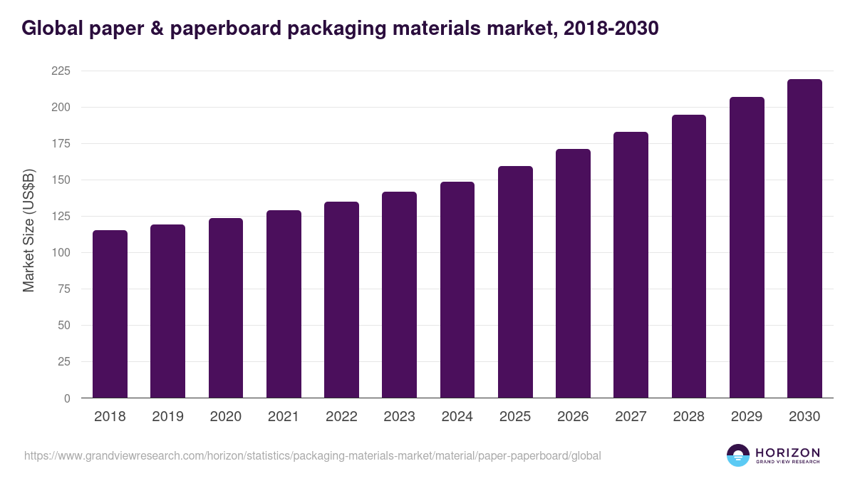 The global paper & paperboard packaging materials market size was valued at US$ 148.3 billion in 2024 and is estimated to grow at a compound annual growth rate (CAGR) of 6.5% from 2024 to 2030.