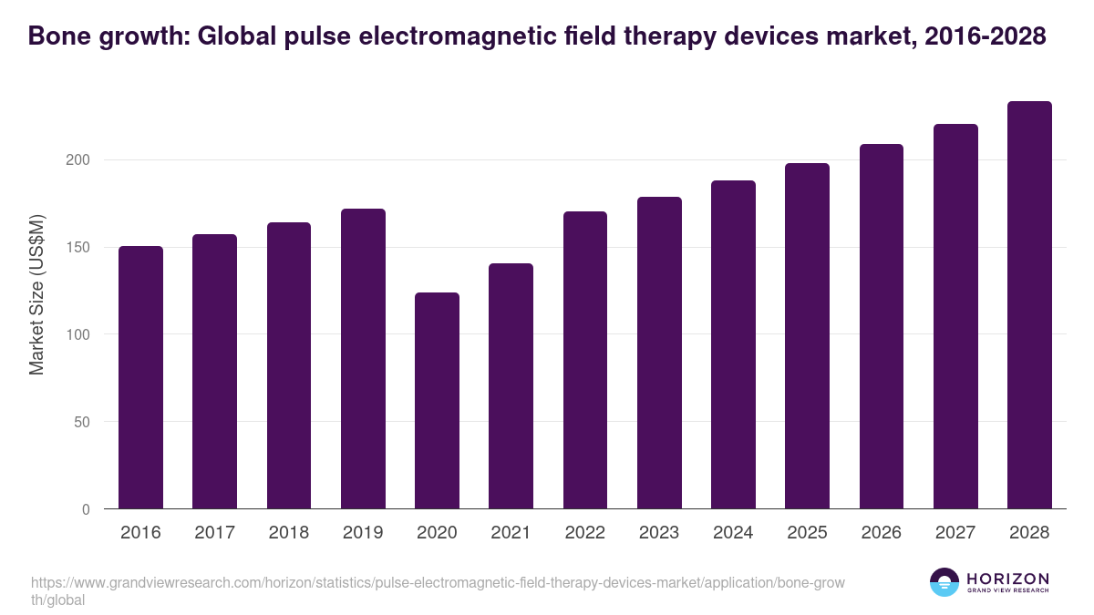 The global bone growth pulse electromagnetic field therapy devices market size was valued at US$ 140.7 million in 2021 and is estimated to grow at a compound annual growth rate (CAGR) of 7.5% from 2021 to 2028.