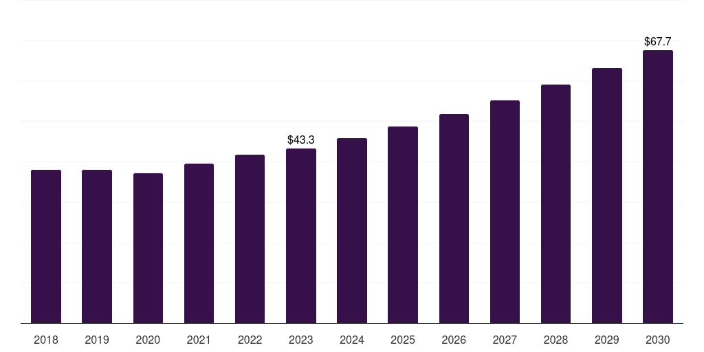 The global cosmetics sodium benzoate market size was valued at US$ 43.3 million in 2023 and is estimated to grow at a compound annual growth rate (CAGR) of 6.7% from 2023 to 2030.
