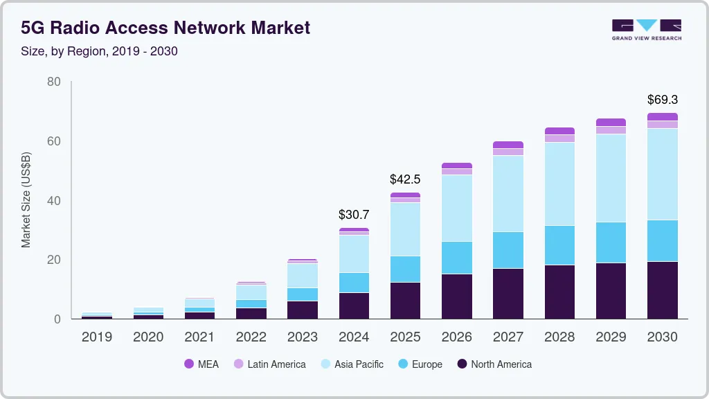 b. The global 5G radio access network market is expected to grow at a compound annual growth rate of 10.3% from 2025 to 2030 to reach USD 69,297.1 million by 2030.