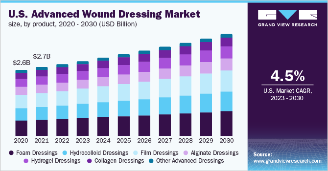 b. The global advanced wound dressing market is expected to grow at a compound annual growth rate of 4.5% from 2023 to 2030 to reach USD 10.5 billion by 2030.