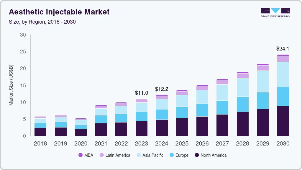b. The global aesthetic injectable market is expected to grow at a compound annual growth rate of 12.1% from 2024 to 2030 to reach USD 24.13 billion by 2030.