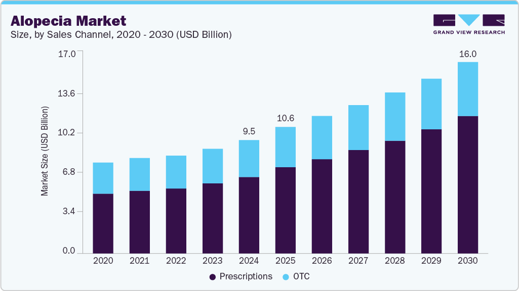 The sales channel for the alopecia market is dominated by the prescription segment with a share of 67.57%, due to the high number of visits to dermatologists for hair loss treatment. Moreover, a strong product pipeline, growing disposable incomes, and rising prevalence of chronic diseases which ultimately lead to hair loss are expected to drive the segment growth at the fastest rate over the forecast period.