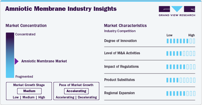 The amniotic membrane industry is characterized by a high degree of innovation, with advancements in preservation techniques, such as cryopreservation and vacuum drying. For instance, in April 2024, NuVision Biotherapies' vacuum-dried amnion, Omnigen, offers room-temperature stability and quick rehydration, making it practical for non-surgical applications. This innovation reduces logistical barriers and expands usage to outpatient settings, significantly impacting the market. It is used in treatments for limbal stem cell deficiency and pterygium management, with ongoing trials for dry eye disease. These developments enhance accessibility and broaden the therapeutic potential of amniotic membranes.