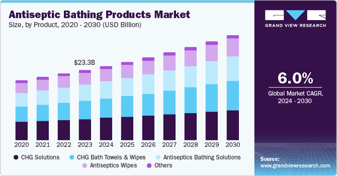 The global antiseptic bathing products market size was valued at USD 23.32 billion in 2023 and is projected to grow at a CAGR of 6.0% from 2024 to 2030. The key factors include rising awareness about the need for hygiene practices, growing infections originating from pathogens, open surgical sites, and infectious bacteria such as Clostridium difficile, which are expected to drive growth. Moreover, increasing concerns regarding HAIs (hospital-acquired infections) are anticipated to encourage the use of antiseptic bathing products, mainly for high-risk patients in medical settings.