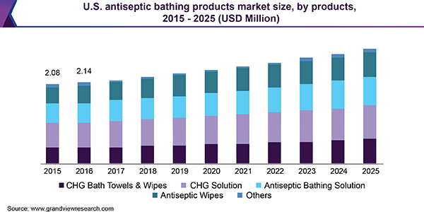 Continuous investments by key companies in R&D activities encourage the development of novel antiseptic bathing products with improved efficiency and high convenience. Increasing adoption of antiseptic bathing products in healthcare institutions such as hospitals and long-term care facilities to minimize the occurrence of infections is contributing to the expansion of the market. According to the World Health Organization (WHO), numerous harmful effects of healthcare-associated infections and antimicrobial resistance affect people's lives. Every year, more than 24% of patients suffer from healthcare-associated sepsis, and about 52.3% of patients in the intensive care unit do not survive this infection.