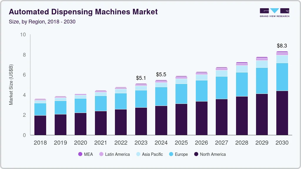 b. The global Automated Dispensing Machines market is expected to grow at a compound annual growth rate of 7.2% from 2023 to 2030 to reach USD 8.31 billion by 2030.