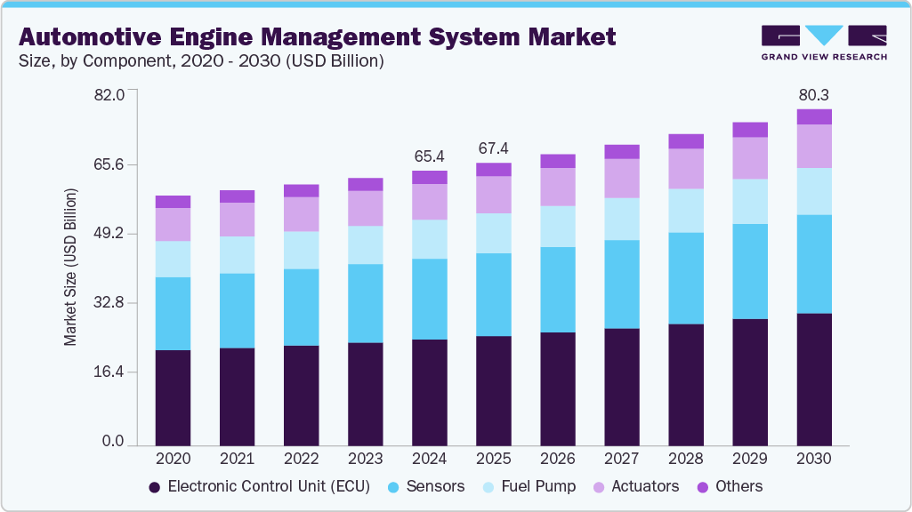 b. The global automotive engine management system market size was estimated at USD 65.54 billion in 2024 and is expected to reach USD 67.40 billion in 2025.
