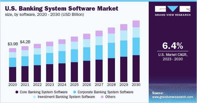 b. The global banking system software market is expected to grow at a compound annual growth rate of 6.2% from 2023 to 2030 and is expected to reach USD 57.78 billion by 2030.