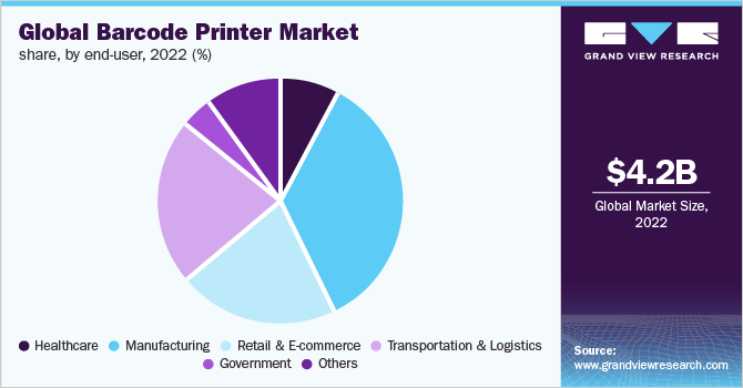 The desktop printers segment is anticipated to witness the fastest growth, growing at a CAGR of 6.8% throughout the forecast period. Desktop barcode printers help businesses in printing labels, tags, and cards quickly, accurately, and efficiently. They can be an ideal tool for businesses that need to produce large volumes of barcoded items. Desktop barcode printers are available in a variety of sizes, styles, and colors; and businesses can choose the appropriate model for their needs. Apart from printing labels and tags, these printers can also print receipts, ID cards, invoices, and other documents. Moreover, these printers are compatible with a variety of software programs that can allow businesses to easily design, print, and manage their barcoded items.