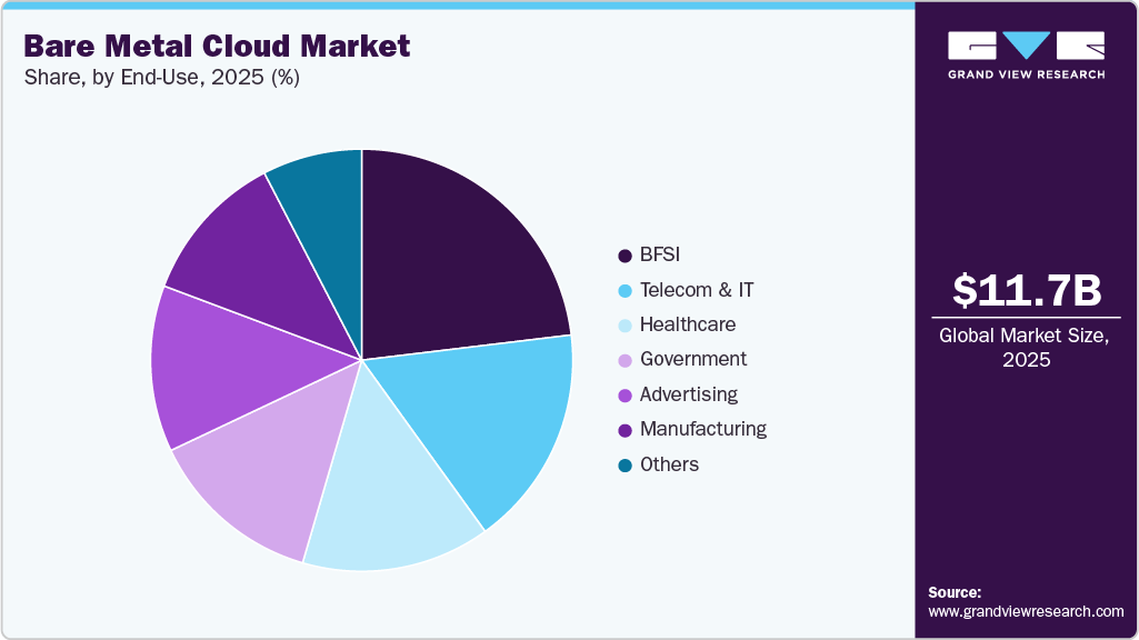 The BFSI segment accounted for the largest market share of 23.0% in 2025, fundamentally driven by its exceptionally high regulatory and performance requirements. As financial institutions increasingly rely on real-time analytics, complex quantitative models, and large-scale stress testing, they require infrastructure that delivers predictable, ultra-low latency performance without the interference that is common in shared environments, along with strong physical and network isolation for sensitive data. This dedicated, single-tenant nature inherent to bare metal addresses critical regulatory compliance mandates, such as PCI DSS, HIPAA, and regional data residency laws, which are challenging to meet reliably within standard virtualized public cloud offerings.