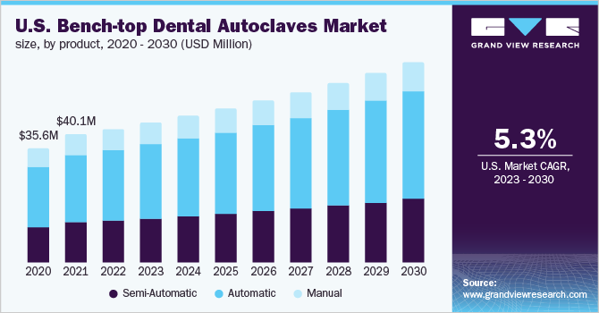 b. The global bench-top dental autoclaves market is expected to grow at a compound annual growth rate of 5.4% from 2023 to 2030 to reach USD 185.2 million by 2030.