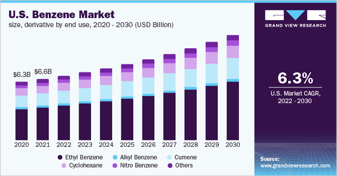 b. The global benzene market is expected to grow at a compound annual growth rate of 6.1% from 2022 to 2030 to reach USD 74.32 billion by 2030.