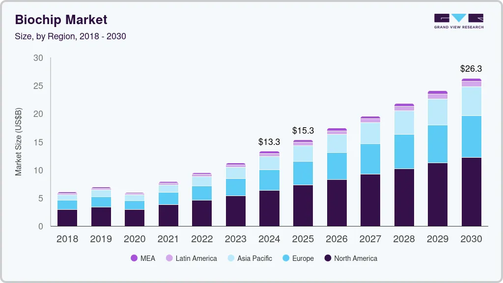 b. The global biochip market is expected to grow at a compound annual growth rate of 11.41% from 2025 to 2030 to reach USD 26.30 billion by 2030.