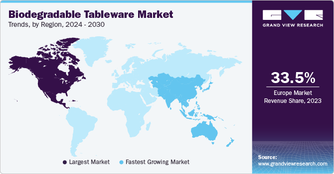 b. Europe dominated the biodegradable tableware market with a share of around 33.6% in 2023. Consumers in the region are highly aware of the environmental impact of synthetic plastics and are actively seeking eco-friendly products.