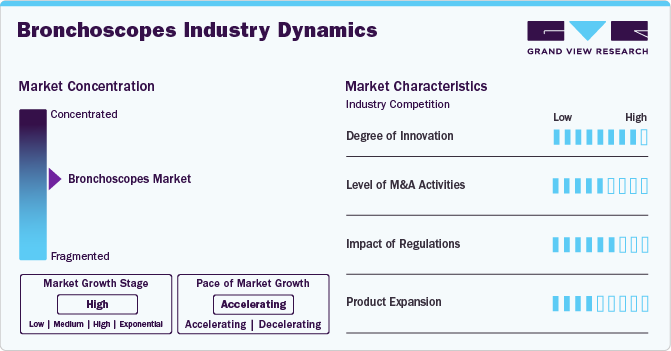 The global bronchoscope market is characterized by a high degree of innovation, owing to rising investments, growing research activities, and the launch of new educational programs to enhance healthcare infrastructure and advance research in this field. For instance, in July 2023, Delray Medical Center, a part of the Palm Beach Health Network, launched the Ion Robotic Bronchoscopy Program to bring novel technology to the platform for lung cancer care.