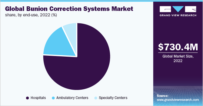 By end use, the hospitals segment held the largest revenue share of 76.2% in 2022. The rising number of patients undergoing correction surgeries at the hospitals contributed positively to the market growth. Moreover, the availability of minimally invasive surgery options for the condition is expected to further boost segment growth during the forecast period. The surgical procedures generally involve removing the swollen tissue, and realigning and straightening the bones in the foot, which helps to reduce the pain and swelling in the foot.