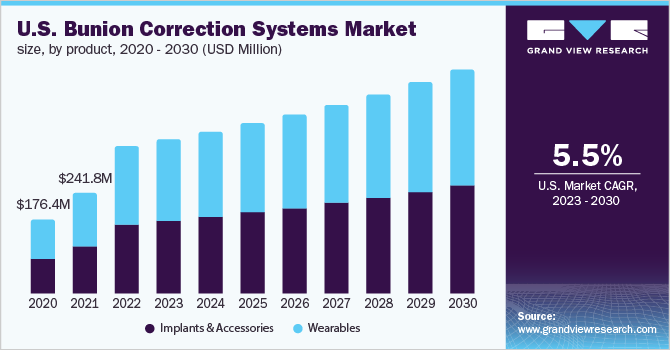 b. The global bunion corrections system market is expected to grow at a compound rate of 6.9% from 2022 to 2030 to reach USD 1.2 billion in 2030.