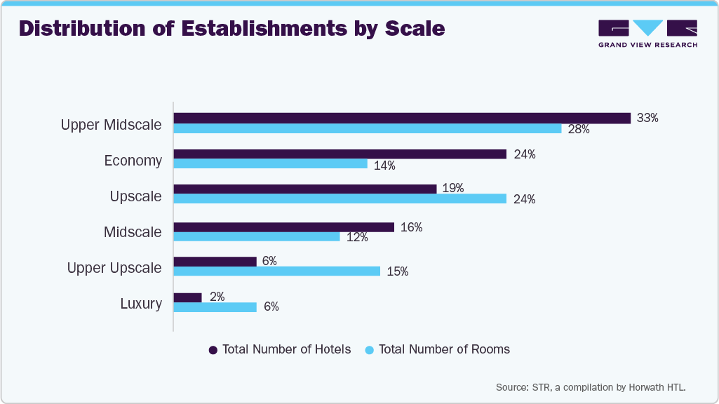 The midscale segment accounted for the largest revenue share of about 49.43% in 2024. These hotels often strike a balance between affordability and comfort, offering essential amenities such as free Wi-Fi, breakfast options, and convenient locations near transportation hubs or tourist attractions. As domestic travel rebounded and international tourism gradually increased, many travelers prioritized value and consistency, which midscale hotels are known for. Additionally, the expansion of branded midscale chains across urban and suburban areas contributed to their growing market presence, helping them dominate nearly half of the market share.