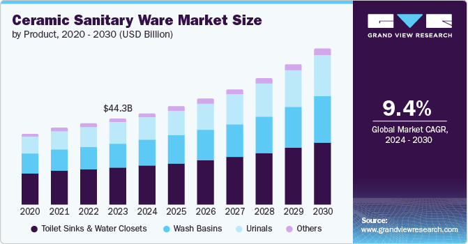 The global ceramic sanitary ware market size was estimated at USD 44.3 billion in 2023 and is projected to reach USD 80.99 billion by 2030, growing at a CAGR of 9.4% from 2024 to 2030. This growth is driven by increased urbanization and rising consumer demand for aesthetically appealing and durable bathroom fixtures.