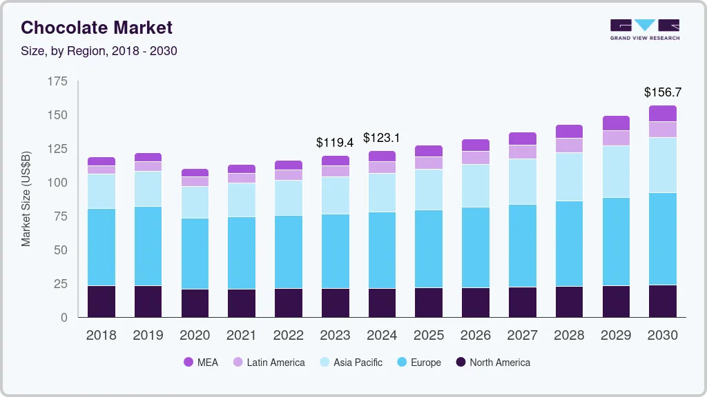 b. The global chocolate market size was estimated at USD 123.05 billion in 2024 and is expected to reach USD 127.05 billion in 2025.