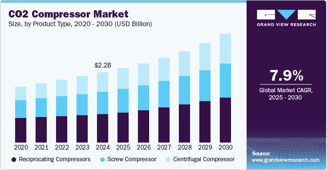 The global CO2 compressor market size was estimated at USD 2.16 billion in 2024 and is projected to reach USD 3.34 billion by 2030, growing at a CAGR of 7.9% from 2025 to 2030. The global CO2 compressor market is growing due to several key factors.