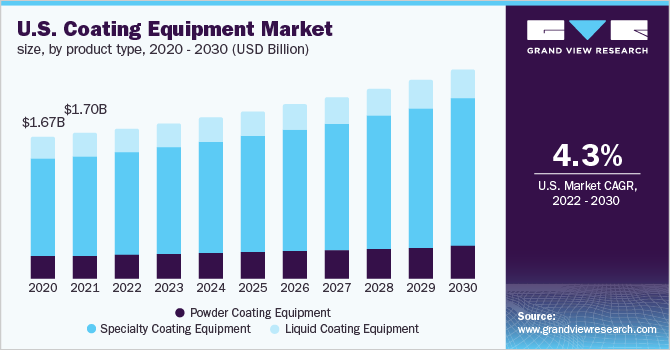 b. The coating equipment market, in terms of revenue, is expected to grow at a compound annual growth rate of 5.3% from 2022 to 2030 to reach USD 25.99 billion by 2030