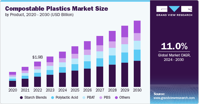 Compostable Plastics Market (2025 - 2030) Size, Share & Trends Analysis Report By Product (Polylactic Acid, Starch Blends, PBAT, PBS), By End-use (Packaging, Agriculture, Consumer Goods, Textile, Automotive & Transportation), By Region, And Segment Forecasts