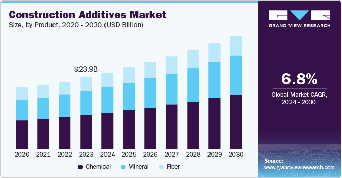 The global construction additives market size was valued at USD 23.87 billion in 2023 and is projected to reach USD 37.71 billion by 2030, growing at a CAGR of 6.8% from 2024 to 2030. As cities expand to accommodate increasing populations, the demand for residential, commercial, and industrial construction projects has increased.