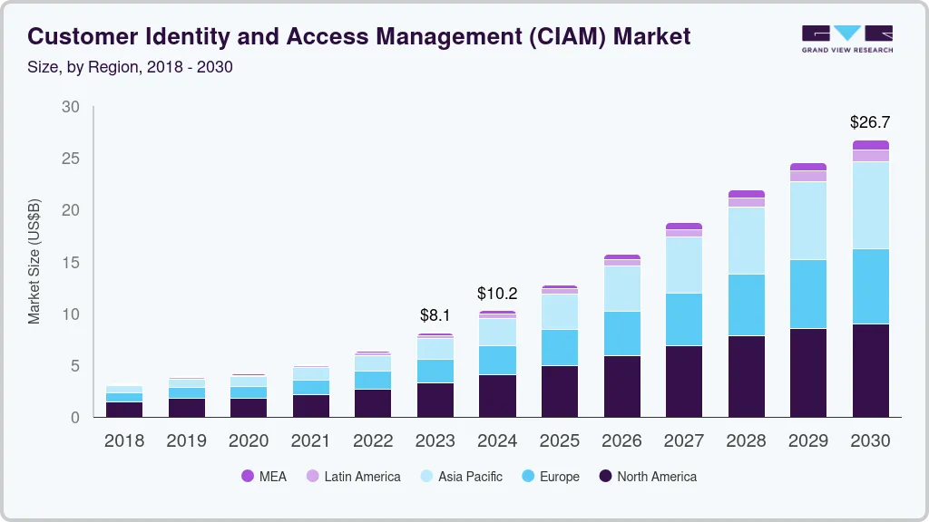 b. The global customer identity and access management (CIAM) market is expected to grow at a compound annual growth rate of 17.4% from 2024 to 2030 to reach USD 26.72 billion by 2030.