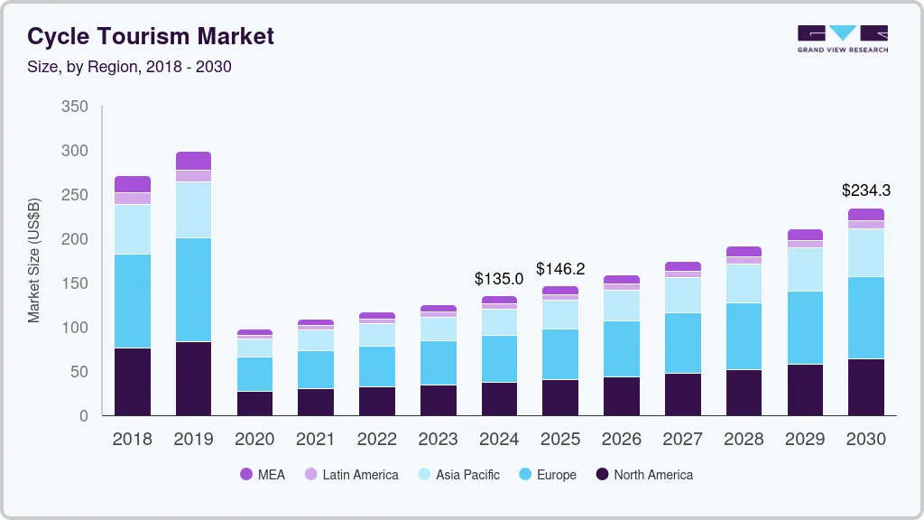 The global cycle tourism market size was estimated at USD 135.04 billion in 2024 and is projected to reach USD 234.30 billion by 2030, growing at a CAGR of 9.9% from 2025 to 2030. As travelers increasingly seek sustainable and immersive travel experiences, the demand for cycle tourism is increasing.