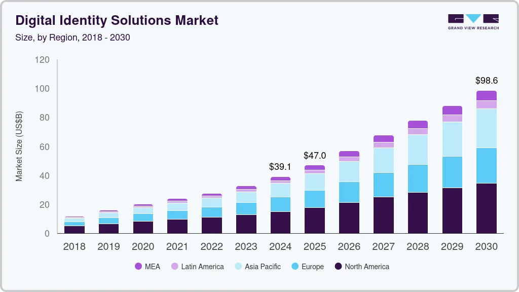 b. The global digital identity solutions market size was estimated at USD 39.07 billion in 2024 and is expected to reach USD 47.02 billion in 2025.