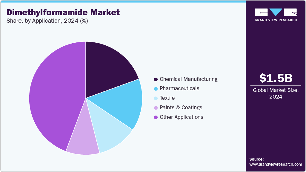 The solvent segment led the market in 2024, accounting for the largest revenue share of 51.4%. Dimethylformamide (DMF) is widely acknowledged as a dipolar aprotic solvent, offering outstanding solvency for a broad array of organic, inorganic, and resin-based materials. Its complete miscibility with water further enhances its versatility across industrial applications, such as chemical manufacturing, pharmaceutical production, and synthetic leather fabrication. Its high boiling point and thermal resilience also make it ideal for high-temperature processes, contributing to its extensive use in industries that demand precise and reliable chemical reactions.