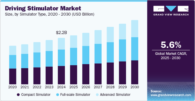 The global driving simulator market size was estimated at USD 2.16 billion in 2024 and is projected to reach USD 2.98 billion by 2030, growing at a CAGR of 5.6% from 2025 to 2030. The market growth is attributed to the increasing focus on improving road safety is prompting governments and organizations to adopt advanced training solutions, such as driving simulators, to enhance driver skills and reduce accidents.