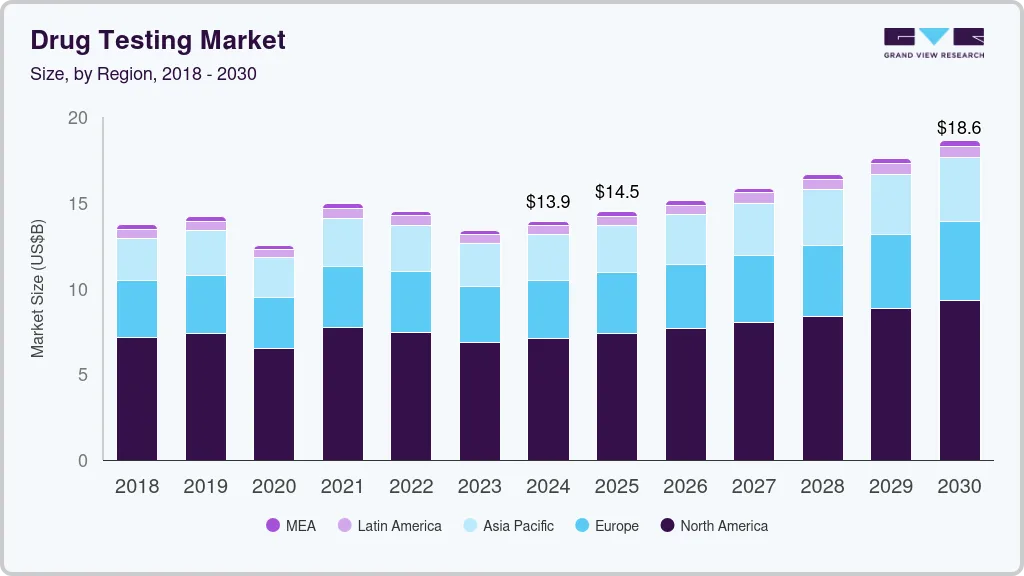 b. The global drug testing market size was estimated at USD 13.91 billion in 2024 and is expected to reach USD 14.49 billion in 2025