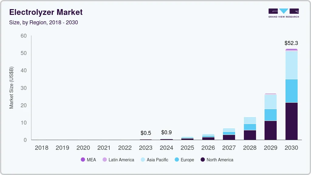 b. The global electrolyzer market is expected to grow at a compound annual growth rate of 95.2% from 2024 to 2030, reaching around USD 52.32 billion by 2030.