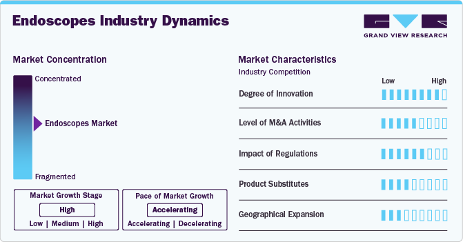 The endoscopes market is characterized by medium merger and acquisition activity. Market players, such as Olympus Corp., Ethicon US, LLC, Fujifilm Holdings Corp., Boston Scientific Corp., Karl Storz GmbH & Co., KG, Stryker, and Medtronic, are involved in mergers and acquisitions. Through M&A activity, these companies can expand their geographic reach and enter new territories. For instance, in December 2022, Olympus Corporation signed an agreement to acquire Odin Vision, a London-based cloud-AI endoscopy company, to enhance patient care by transforming procedural and clinical workflows.