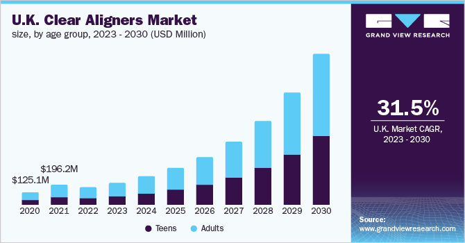 The clear aligners market in Germany accounted for the largest revenue share of 24.9% in 2023. The easy availability of advanced dental facilities is one factor expected to facilitate market growth over the coming decade. Various factors, such as growing adoption and awareness about aesthetic procedures, technological advancements, rising collaborations, availability of skilled professionals, and increasing beauty consciousness, are driving the market growth. In Germany, dental insurance coverage varies significantly depending on whether individuals are covered under public or private health insurance schemes. According to the Germany Visa article published in August 2023, public health insurance generally covers essential dental services, such as check-ups, fillings, and some preventive care, with subsidies increasing based on regular preventive behaviors recorded in bonus booklets. However, coverage for complex procedures can be limited, with public insurance typically reimbursing up to 75% of costs.