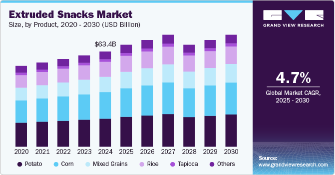 The global extruded snacks market size was estimated at USD 63.38 billion in 2024 and is projected to reach USD 74.52 billion by 2030, growing at a CAGR of 4.7% from 2025 to 2030. The growing demand for convenience and on-the-go products, driven by busy lifestyles and an expanding workforce, is a key factor in the market's development.