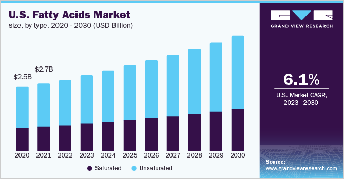 b. The global fatty acids market is expected to grow at a compound annual growth rate of 4.9% from 2022 to 2030 to reach USD 40.05 billion by 2030.