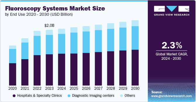 The global fluoroscopy systems market size was valued at USD 2.03 billion in 2023 and is projected to grow at a CAGR of 2.3% from 2024 to 2030. Growing geriatric population, chronic diseases and increasing adoption of fluoroscopy in pain management are key drivers fueling market. Advancements in fluoroscopy technology, including the shift to digital imaging, methods to reduce radiation dose, incorporation with other imaging techniques, and improved visualization aids, are further driving the market's expansion. These technological advancements enhance the quality of images, safety for patients, and efficiency in procedures, broadening the use of fluoroscopy in various medical settings.