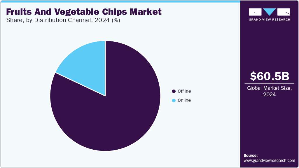 The vegetable chips segment held the largest market revenue share of 94.8% in 2024. Vegetable chips provide a convenient way to add more vegetables to the diet while offering a crunchy, flavorful snack. They retain many nutrients found in whole vegetables, especially when made with minimal additives. These chips are typically lower in fat, salt, and sugar compared to traditional snacks, making them a healthier choice. They can aid in weight management, promote heart health, and reduce the risk of diseases such as type 2 diabetes. Available in various flavors and made from vegetables like sweet potatoes, kale, and zucchini, vegetable chips serve as an excellent alternative to processed snacks. By opting for nutrient-dense options, they can support a balanced diet.