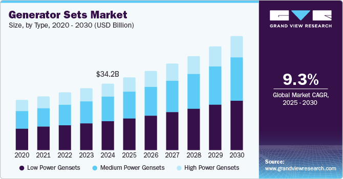 The global generator sets market size was estimated at USD 34,166.6 million in 2024 and is projected to reach USD 57,926.1 million by 2030, growing at a CAGR of 9.3% from 2025 to 2030. This growth is attributed to the increasing frequency of power outages, rapid industrialization, and urbanization.