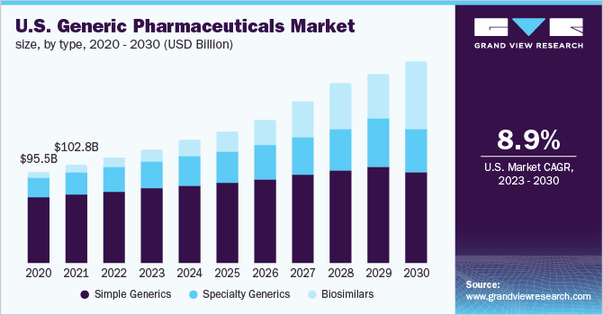 b. The global generic pharmaceuticals market is expected to witness a compound annual growth rate of 8.9% from 2023 to 2030 to reach USD 682.9 billion in 2030.