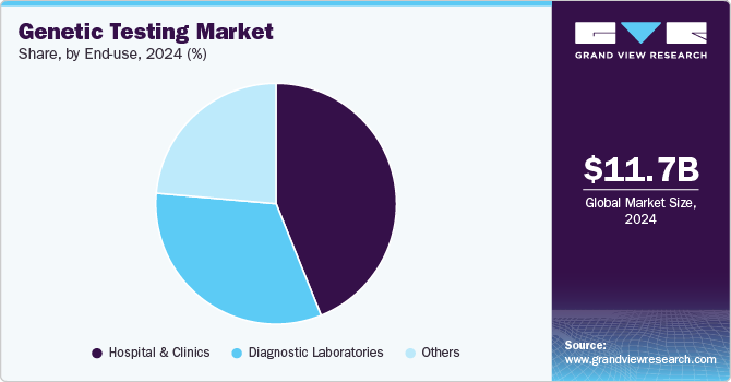 Based on end use, the hospitals and clinics segment led the market with the largest revenue share at 43.9% in 2024. The genetic testing industry is being propelled by mandatory newborn screening for genetic disorders and a growing prevalence of cancer across various regions. In the U.S., approximately 98% of births occur in hospitals, and an increase in hospital and clinic capacities is expected to further drive testing demand. Supporting this growth, the Australian government announced a healthcare budget of USD 70.12 billion for 2022-2023, marking a 5.7% increase from the previous year, with USD 26.27 million dedicated specifically to expanding newborn screening programs.