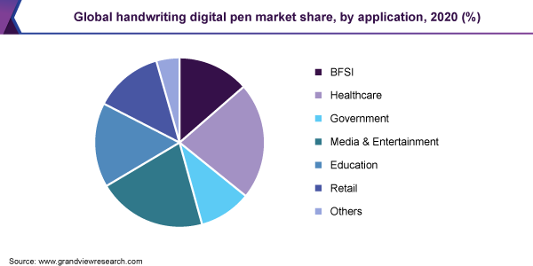 b. The healthcare segment led the handwriting digital pen market with a revenue share of over 22% in 2020 and is projected to grow at a steady CAGR of over 7% from 2021 to 2028.